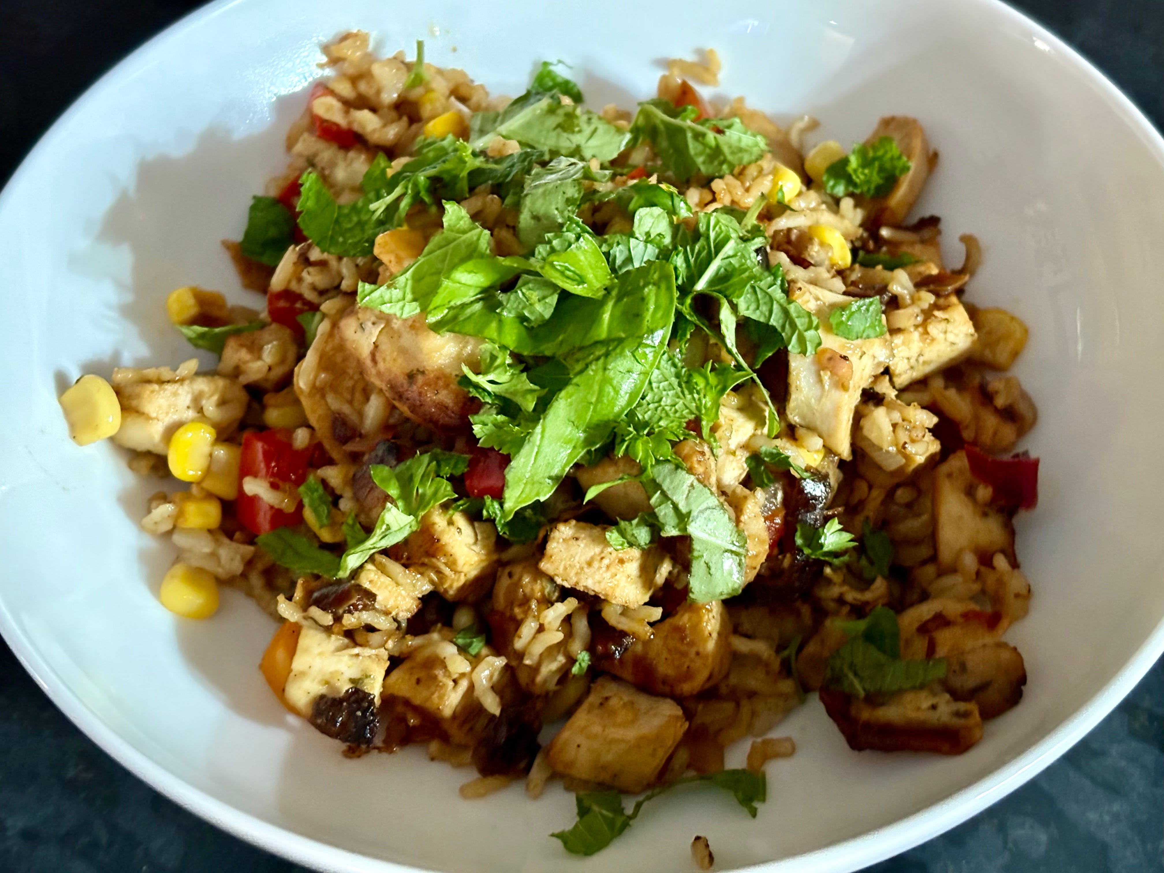 Dinner was some leftover cooked chicken fried with ground cumin, a tiny tin of corn, some capsicum (bell pepper), a packet of pre-cooked brown rice and dates. Mix it all together in the frypan and add a tiny bit of stock or water. Serve with fresh herbs if you have them, and a squeeze of lemon.