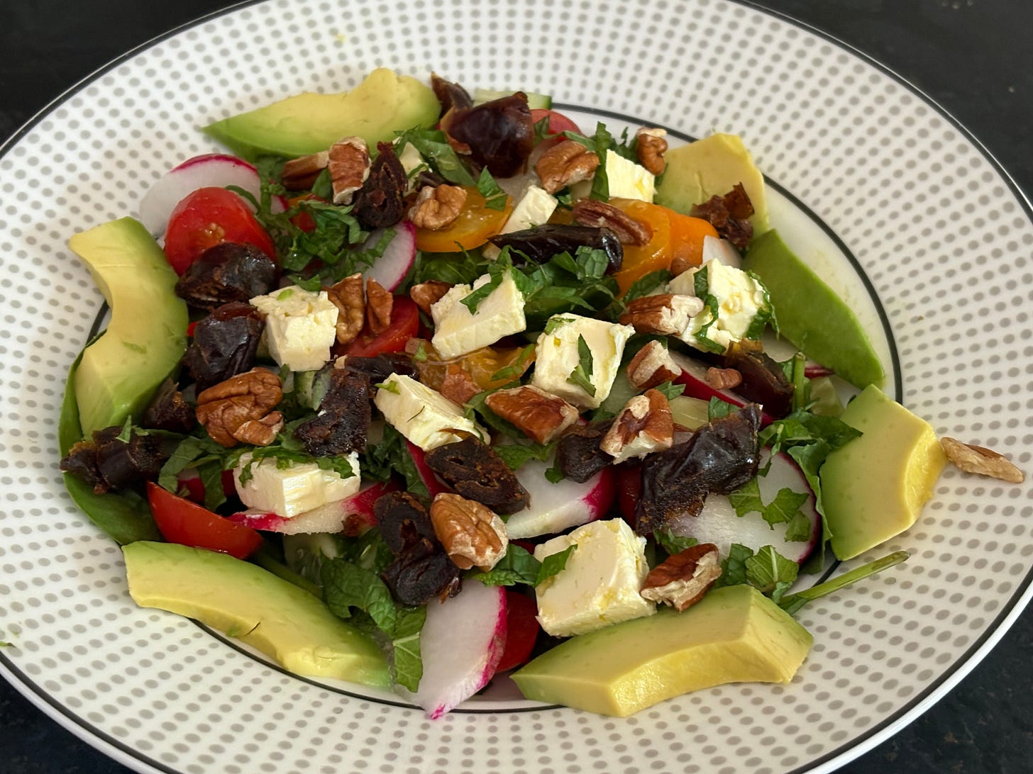 Lunch was a salad made with avocado, feta cheese, tomatoes, radish, mint, pecans (again) and dates. Delicious!