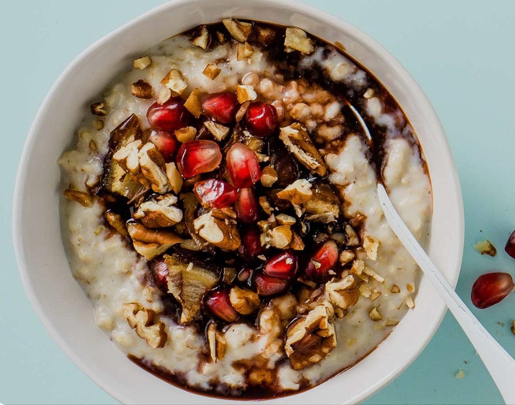 Breakfast was porridge made with rolled oats, coconut, cinnamon, pecans, and of course, chopped dates. I forgot to take a photo, but it looked a lot like this (except without the pomegranate seeds because I am not a millionaire).